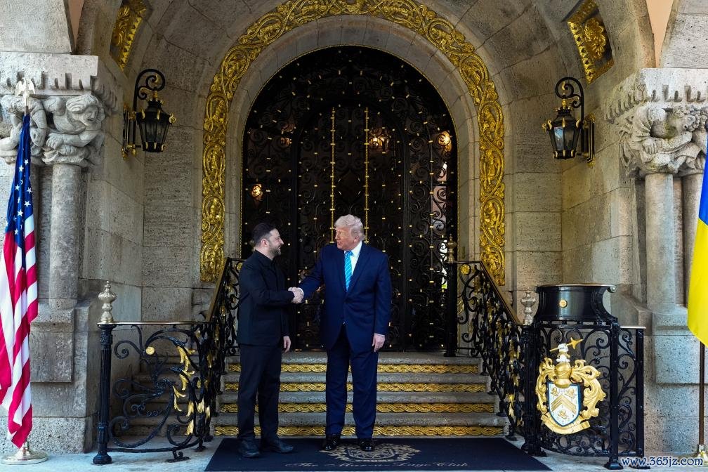 2025年12月28日下午,美国总统特朗普在美国佛罗里达州海湖庄园同乌克兰总统泽连斯基举行会晤。这是特朗普在海湖庄园门口迎接泽连斯基。新华社/美联