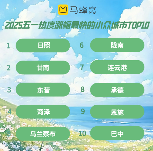 除了在大城市中寻秘境聚赢盘,高性价比、相对“冷门”的小城也成为年轻人节假日的理想之选。日照、甘南、东营、菏泽、乌兰察布、陇南、连云港、承德、恩施、巴中跻身马蜂窝“五一”热度涨幅最快的小众城市前十。