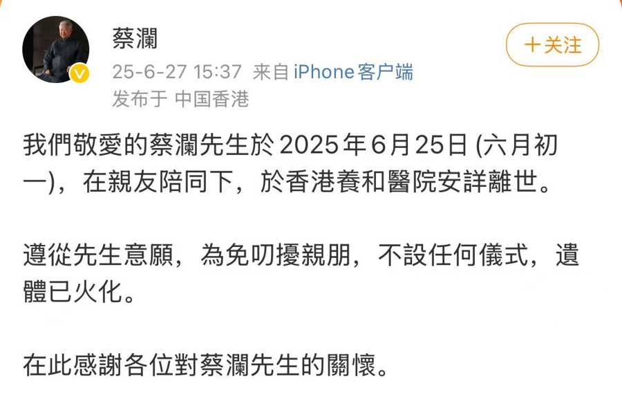 6月27日,蔡澜微博发文:“我们敬爱的蔡澜先生于2025年6月25日,在亲友陪同下,于香港养和医院安详离世。遵从先生意愿,为免叨扰亲朋,不设任何仪式,遗体已火化。”
