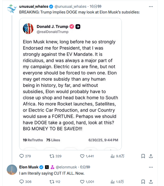 早在6月初,马斯克在其社交媒体平台X上批评国会支出法案“令人作呕”,并呼吁议员取消支持。特朗普随后发声反击,暗示将重新审视特斯拉及其旗下企业所获得的政府补贴与合约,“我非常失望,我们的关系还能维持多久,现在也很难说。”