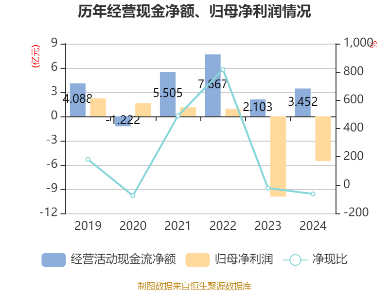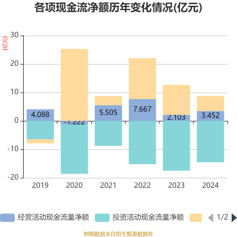 截至2024年,公司经营活动现金流净额为3.45亿元,同比增长64.16%;筹资活动现金流净额5.31亿元,同比减少5.23亿元;投资活动现金流净额-14.57亿元,上年同期为-17.52亿元。