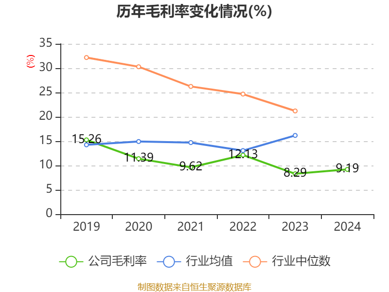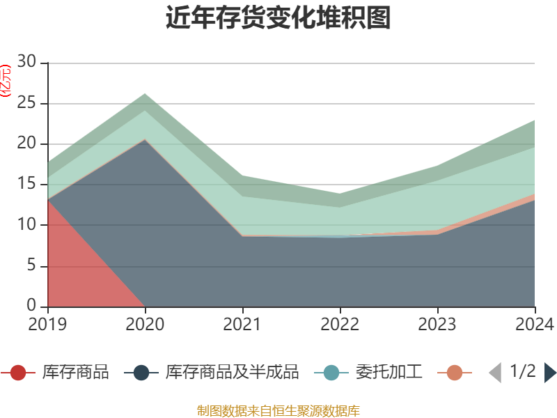 从存货变动来看,截至2024年末,公司存货账面价值为22.92亿元,占净资产的105.08%,较上年末增加5.6亿元。其中,存货跌价准备为2.84亿元,计提比例为11.03%。