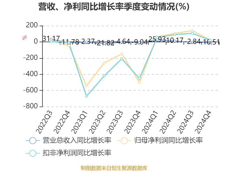 中证智能财讯联创电子(002036)4月26日披露2024年年度报告。2024年,公司实现营业总收入102.12亿元,同比增长3.69%;归母净利润亏损5.53亿元,上年同期亏损9.92亿元;扣非净利润亏损6.1亿元,上年同期亏损10.15亿元;经营活动产生的现金流量净额为3.45亿元,同比增长64.16%;报告期内,联创电子基本每股收益为-0.52元,加权平均净资产收益率为-22.30%。