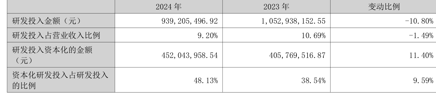 2024年全年,公司研发投入金额为9.39亿元,同比下降10.8%;研发投入占营业收入比例为9.2%,相比上年同期下降1.49个百分点。此外信康配资,公司全年研发投入资本化率为48.13%。
