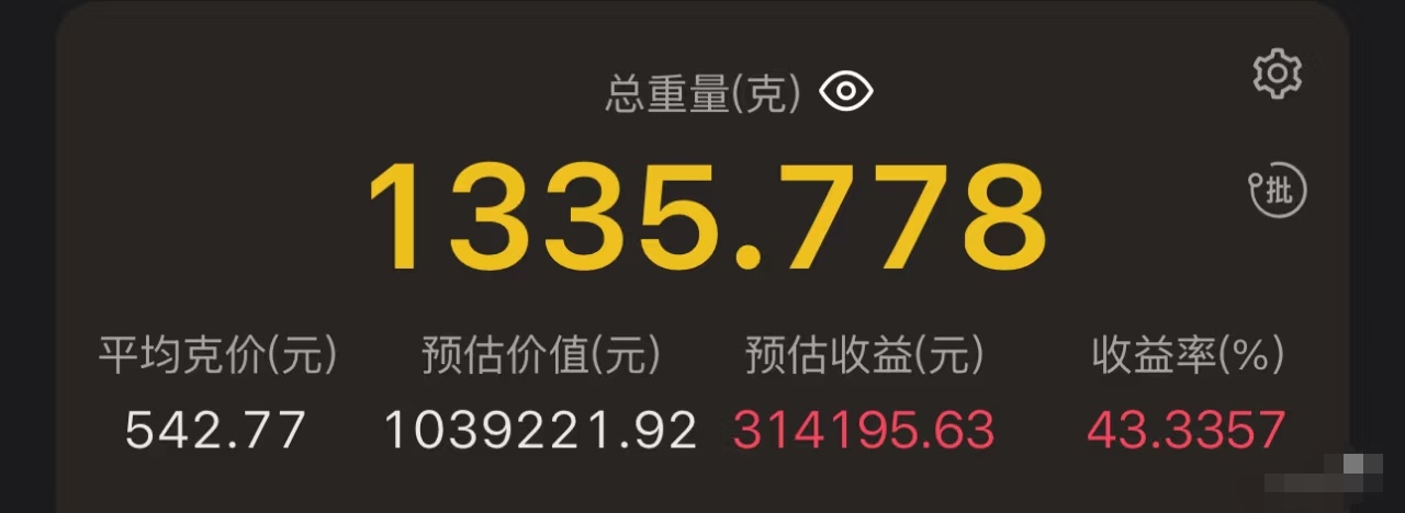同样热闹的还有社交平台的评论区,网友“蘑菇鸡蛋”晒出截图,她在前两年以均价568每克的价购入黄金500多克,截至目前收益已达15万元;网友“卷卷”以均价602每克共计897823元购入1490克黄金,如今预估价值超120万元,预估收益超38万元,收益率高达42.83%。