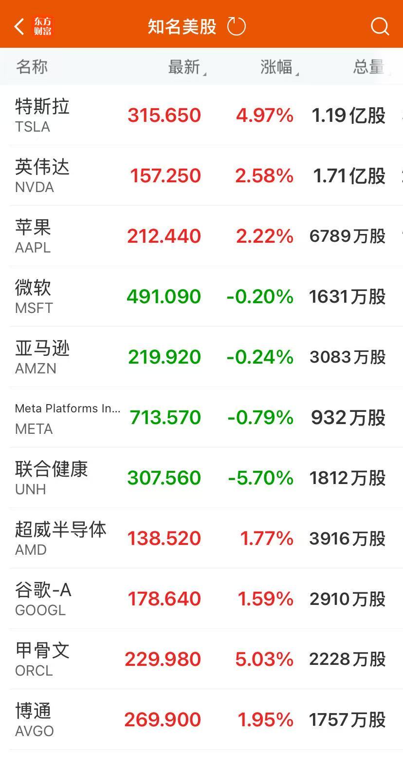 科技股集体上涨,特斯拉涨近5%,甲骨文涨超5%,英伟达、苹果涨超2%。