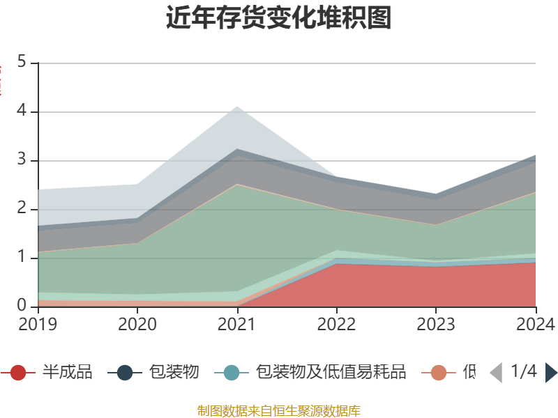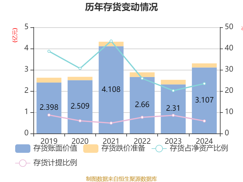 从存货变动来看,截至2024年末,公司存货账面价值为3.11亿元,占净资产的23.48%,较上年末增加7966.97万元。其中,存货跌价准备为1942.7万元,计提比例为5.88%。
