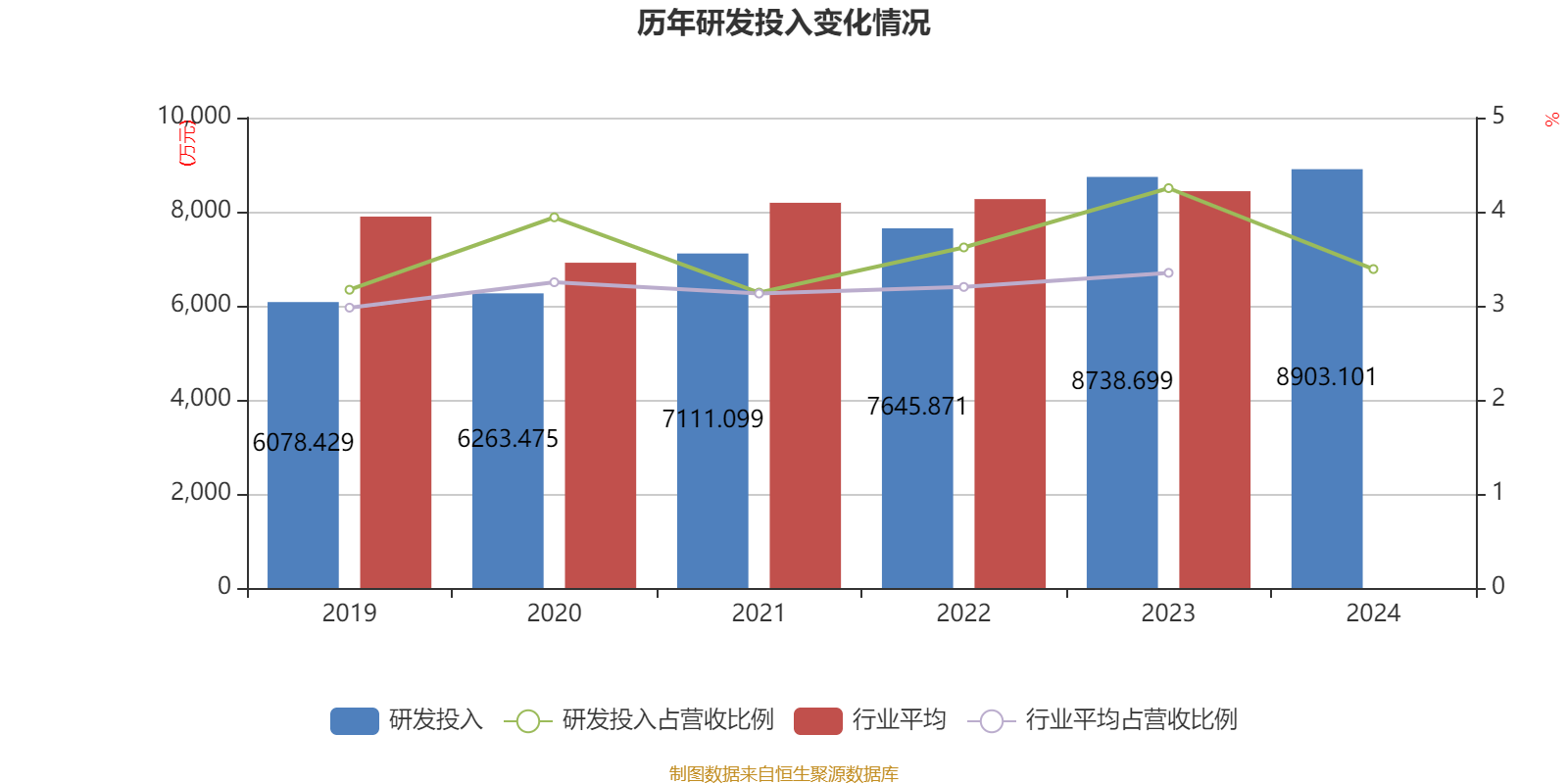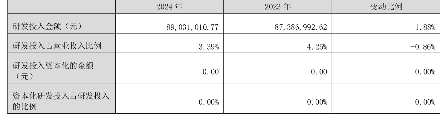 2024年全年,公司研发投入金额为8903.1万元,同比增长1.88%;研发投入占营业收入比例为3.39%,相比上年同期下降0.86个百分点。此外,公司全年研发投入资本化率为0%。
