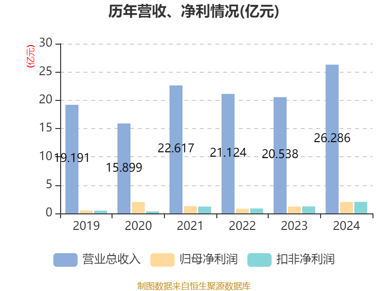 中证智能财讯浔兴股份(002098)4月26日披露2024年年度报告。2024年,公司实现营业总收入26.29亿元,同比增长27.98%;归母净利润2.02亿元,同比增长67.37%;扣非净利润2.03亿元,同比增长64.35%;经营活动产生的现金流量净额为2.62亿元,同比增长17.59%;报告期内,浔兴股份基本每股收益为0.564元,加权平均净资产收益率为16.40%。公司2024年度分配预案为:拟向全体股东每10股派现1元(含税)。