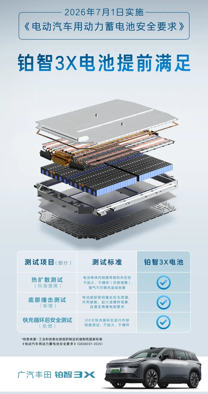 再如消费者非常关心的动力电池安全,铂智3X电池已提前满足2026年7月1日开始实施的《电动汽车用动力蓄电池安全要求》,并通过了多项严苛测试。新标准对电池的耐高温、抗撞击、快充寿命等性能提出了更高要求,比如:热失控后不起火、不爆炸;底部撞击“零泄漏”;快充300次后依然安全等。这些标准被业内称为“史上最严”,而广汽丰田的铂智3X电池提前“交卷”。优异表现源自广汽丰田在安全上追求的“冗余”,设计之初就不仅仅是考虑法规数值,而是以自己更加严苛的标准进行开发。